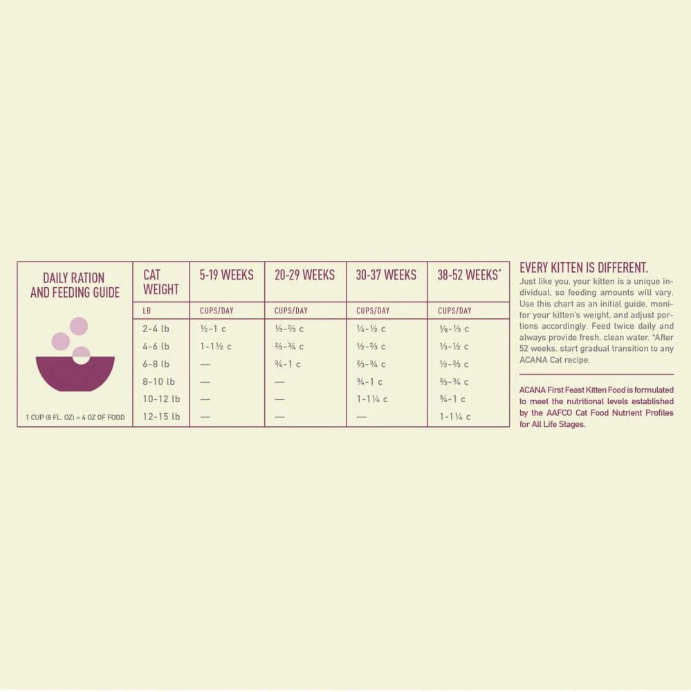 Your kitten is an obligate carnivore, genetically designed for a diet that is rich in protein from whole animal ingredients. Crafted to provide everything your kitten needs for peak growth and development, ACANA First Feast is brimming with 70% free-run chicken and whole herring in WholePrey ratios of meat, organs, and cartilage or bone, providing your kitten with everything they need in order to grow up healthy, happy, and strong, with a delicious flavor that they’ll love.